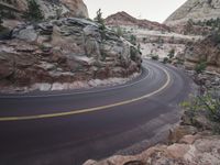 a winding, curved highway surrounded by mountains with a rock outcropping at the bottom