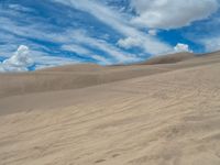 a desert scene with some very big clouds in the sky and some sand dunes with many different colored lines, and the grass has been scattered over allover the tops