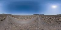 a fish eye view looking back at the desert landscape with dirt paths in front of it