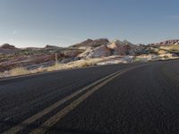 A desert road in Colorado at dawn. The asphalt stretches through the landscape, winding around curves and showcasing the rugged beauty of the mountains. The clear sky adds to the sense of wilderness.