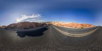 a long empty road going through the desert on an orange rock side, with a large sky