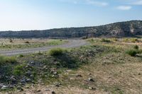 a dirt road surrounded by dry grass and rocks with a dirt field behind it with hills in the background
