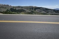 the road is empty but there are yellow lines on it as well as the mountains