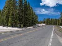 A scenic road in Colorado, USA with asphalt leading to a beautiful landscape. Clouds fill the sky on this sunny day. The road winds up to the summit, providing stunning views of nature.