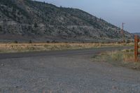 the street is empty and dirt covered by rocks and weeds while the mountain is in the distance