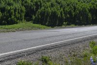 a small truck on a empty, deserted road in the country side with forest behind it