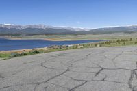 This is a beautiful landscape photo taken at Taylor Park Reservoir in Crested Butte, Colorado, USA. The image shows a clear sky reflecting on the azure surface of the lake. The grassy plain and vegetation surrounding the reservoir create a stunning natural backdrop. A road with asphalt surface cuts through the picture, leading to the open space and mountainous terrain in the distance. This photo perfectly captures the serene beauty of nature and the abundance of water resources in this biome.