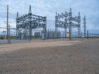 Gloomy day in Colorado with a grey sky overhead. The landscape is dominated by a power plant surrounded by gravel and sand surfaces. The natural elements mix with man-made infrastructure, creating an intriguing contrast.