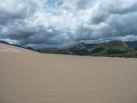 The Great Sand Dunes National Park in Colorado showcases the unique and vast sandy landscape. Desert-like conditions create gloomy atmosphere, with grey skies and open spaces. Mountains in the background add to the natural beauty.