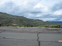 A beautiful landscape in Colorado, USA, featuring a road lined with asphalt and surrounded by stunning scenery. A serene lake and campground can be seen in the distance, with fluffy clouds dotting the sky. A perfect day to explore nature.