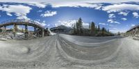 a photo of a large train on a track surrounded by mountains and trees, on a panorama fisheye
