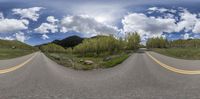Straight road cutting through a rural landscape in Colorado, USA. Mountains and forests create a scenic backdrop under a cloud-dotted sky. Hard shadows cast by aspens add depth to the nature-filled surroundings.