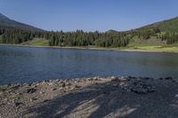 a rocky shore next to the water in a lake surrounded by mountains and trees on a clear day