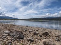 a lake with rocks on the shore and mountains in the background along side it and snow capped hills