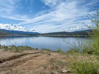 A scenic landscape of a lake surrounded by mountains in Colorado, USA. Clear skies and fluffy clouds reflect on the calm water surface. The rocky terrain and sandy areas add natural beauty to the scene.
