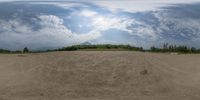 a man standing on top of a sandy hill next to a forest filled with trees