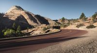 This is an image of a scenic mountain road in Colorado, USA. The asphalt road winds through the low desert landscape, with mountains in the background. The clear sky above creates a picturesque backdrop for the natural beauty of the area. The road surface curves through the mountain pass, showcasing the wilderness and breathtaking views of the surrounding nature. This photo captures a typical day in Colorado, highlighting the rugged landscape and the tranquility of the wilderness. It is taken in Zion National Park, showcasing the majestic Mount Zion in the distance.