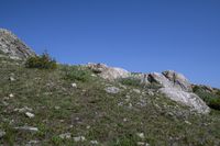 a black frisbee is sitting atop some rocks and boulders on the hillside,