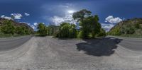 the view from a 360 - lens lens of an empty street in the mountains near some trees