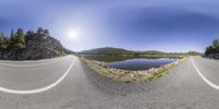 three roads that are near water and rocks in the middle of the road, with sun shining on a large body of water