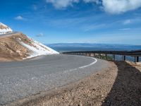 a man is riding his bike down a mountain road with snow and rocks in the background