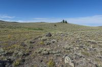 an open area with a very big rocky hillside in the background and bright blue sky above