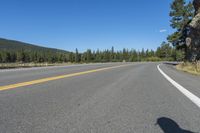 a cyclist taking a photo on a paved highway near trees and mountain with bright blue sky