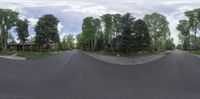 a wide angle photograph of an empty street next to a row of trees, with cars and a fire hydrant on the street