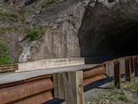 A scenic road in Colorado, surrounded by majestic mountains and clear blue skies. The asphalt road weaves through stunning natural landscapes and passes under a bridge and through a tunnel. A perfect day for a road trip in the USA.