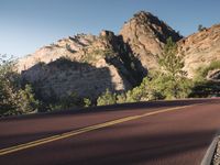 A deserted road in Colorado stretches into the mountainous landscape of Zion National Park. The clear sky contrasts with the lush greenery along the roadside. This untouched wilderness embodies the beauty of Mount Zion.
