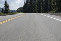 A scenic view of a straight road in Colorado, lined with forest and surrounded by breathtaking nature. The asphalt road surface stretches far into the distance, disappearing into the horizon. A perfect day to explore the beauty of Colorado's landscape.