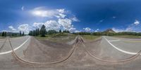 multiple train tracks are shown in a fish eye view lens with clouds and a mountain in the background