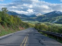 A rural road in Colorado curves through the landscape, surrounded by Aspen trees and the majestic Pikes Peak mountain. The road is lined with Armco barriers and casts long shadows in the hard sunlight of a sunny day in the USA.