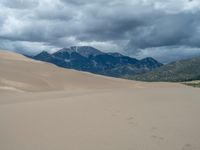 The Great Sand Dunes National Park in Colorado offers a stunning desert landscape with vast open spaces. The gloomy grey sky adds to the dramatic scenery, as mountains stand in the background. The sand dunes create unique patterns on the surface, showcasing the raw beauty of nature.