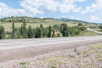 A scenic road in Colorado, surrounded by lush green forests and rolling hills. The clear blue sky is dotted with fluffy white clouds. The perfect day to immerse yourself in nature in Antonito and Chama.