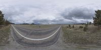 A Colorado landscape at dawn with snow-covered open spaces. Sun visible casting hard shadows on the asphalt road. Clouds adorn the sky as the sun rises, creating a picturesque USA scene.