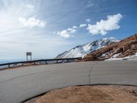 a man is riding his bike down a mountain road with snow and rocks in the background