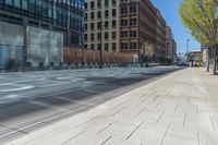 A view of downtown Denver, Colorado, showcasing the modern architecture and bustling city streets. Clear skies create a perfect backdrop for the high-rise office buildings and vibrant cafes and restaurants. The urban landscape is dotted with brick walls and open spaces.