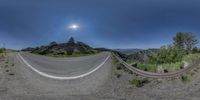 three fisheye image with a bend road between two mountains in the distance, with a man riding a skateboard below