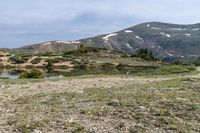 Picturesque landscape near Loveland Pass in Colorado, USA. A field of grass and weeds surrounded by mountains and hills. Clouds linger over Pass Lake, adding to the natural beauty of the rugged terrain.
