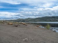 An open space landscape in Colorado, USA. Sunlit beach and lake create a serene atmosphere. Clear day with clouds adding drama to the scene. Nature's beauty reflected on the dirt and gravel surface.