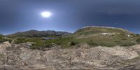 an image of the moon above the mountains in the sky over the water to the right of a river and small green hills