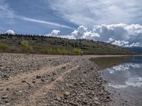 a lake with rocks on the shore and mountains in the background along side it and snow capped hills
