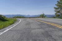 A scenic drive along a straight road in Colorado, USA. Surrounded by majestic mountains and lush vegetation, the road surface is smooth asphalt. Clear sky and a guard rail provide a safe and picturesque journey.
