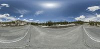 A panoramic view of a road in Colorado, USA. The road cuts through a snowy landscape, surrounded by open spaces and a beautiful lake. Clouds fill the sky, creating a serene winter scene.