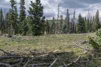 A picturesque view of the Colorado wilderness, with rugged dirt roads winding through the landscape. Lush vegetation surrounds the open spaces, while lodgepole pine, shortleaf black spruce, and balsam fir trees dot the scene. Clouds add drama to the tropical-like atmosphere at La Manga Pass.
