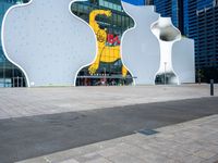 an empty plaza that features a colorful building with many windows and an abstract graphic on the wall