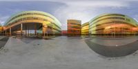 A modern architectural marvel in Holland's business district. Three colorful buildings on a round surface create a vibrant facade. A skateboarder in motion adds a touch of energy to the scene.