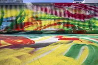 a colorful mural painted on the side of a building next to a sidewalk and two cars