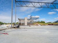 a large empty garage under a blue sky with clouds in the background and construction work is being done on a commercial building site